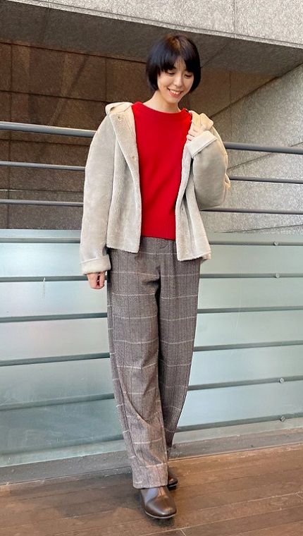 ムートンファーアウター×肩ボタンニット×カーブパンツ