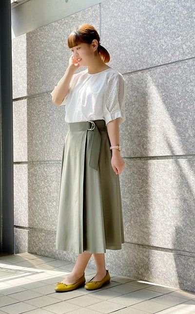 Dカンベルトでウエストマークしたデザインが、腰回りをスッキリと見せてくれます♪