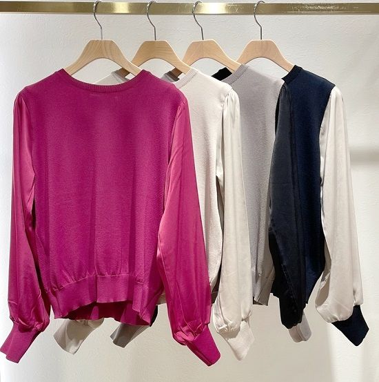 光沢感のあるサテン地のパフ袖がかわいいニット。