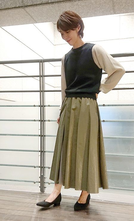 袖サテンニット×チュールリブスカート