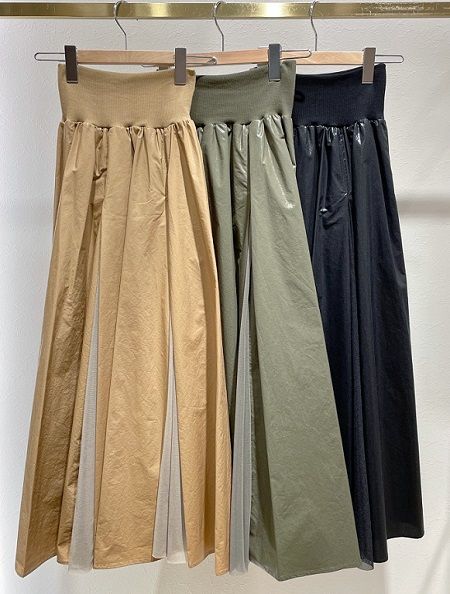 コーディング加工にによる光沢感とチュールの切替えがオシャレなスカート。