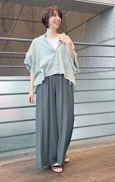 バルーン袖シアーシャツ×ギャザーワイドパンツ