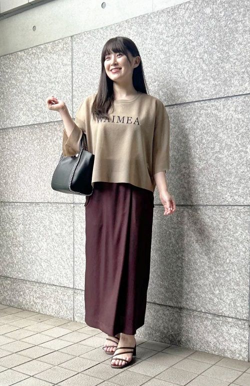 サテンツイルタイトスカート×五分袖刺繍シアーニット