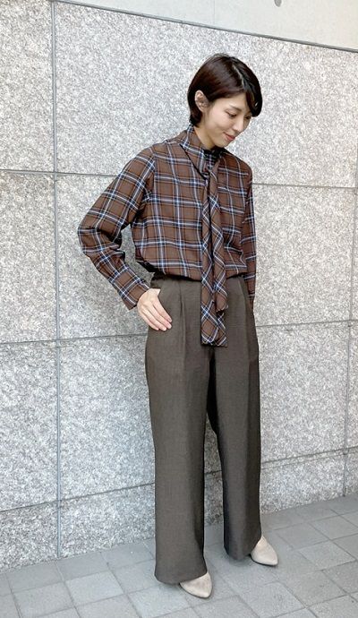 チェック柄ブラウス×ワイドパンツ