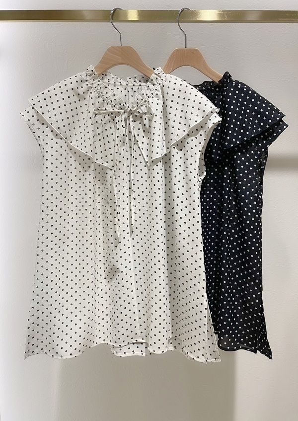 襟元のリボンが可愛い、ドット柄のブラウス。