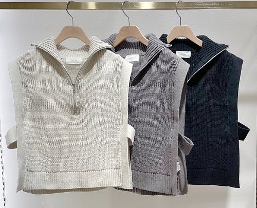 大きな襟とZIPのアクセントがおしゃれなニットベスト。