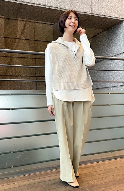 今回は、店頭で人気のニットベストのコーディネートをご紹介致します。