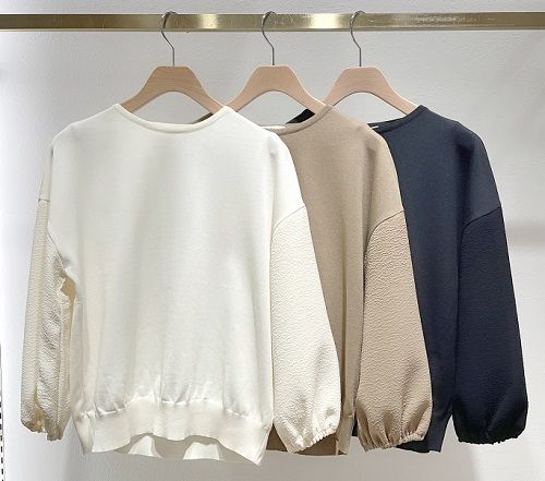 袖に凹凸感のある素地を使用し、シンプルながらトレンド感のある着こなしが楽しめます。