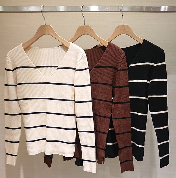 ボーダーVネックリブニット