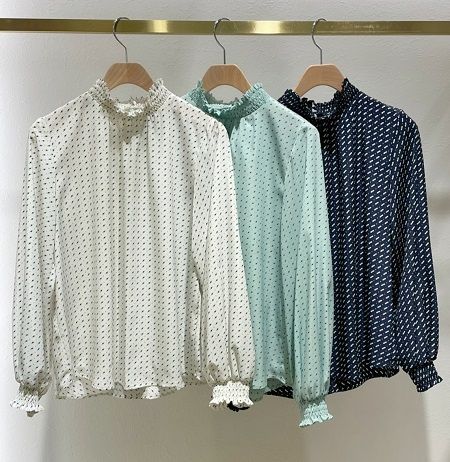 襟元がスッキリと見えるシャーリングブラウス。
