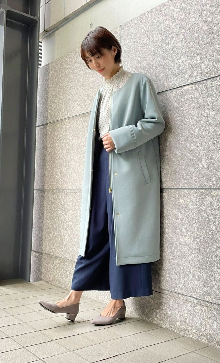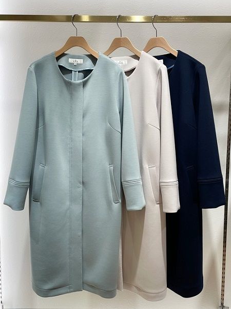 軽くて滑らかな肌触りが心地よい、ノーカラーコート。