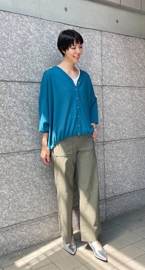 裾ドロストシルバー釦カーディガン× バックラッシュベイカーパンツ