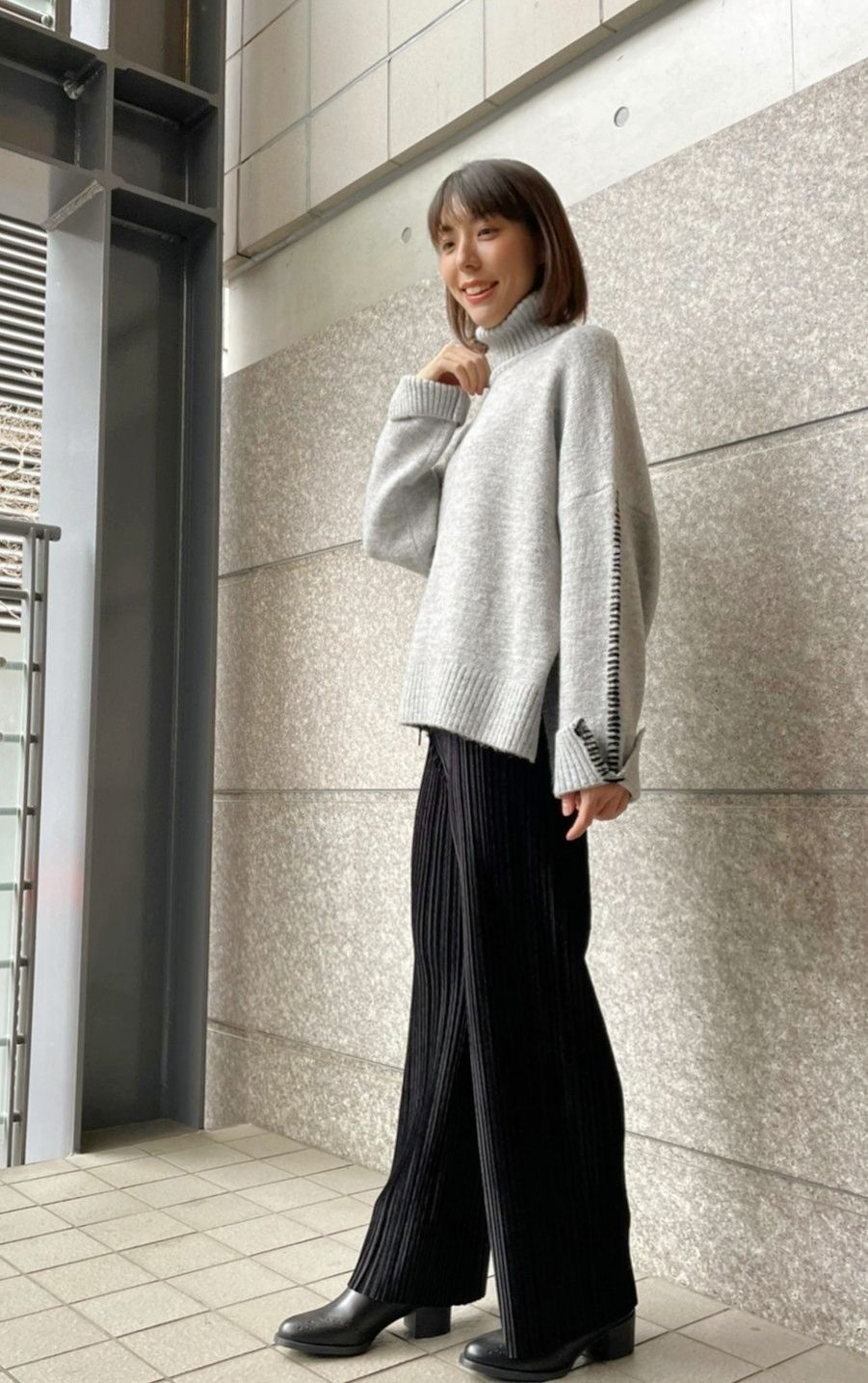 こちらのニットはスカートだけでなく、パンツスタイルで合わせても、かっこよく着こなせます。