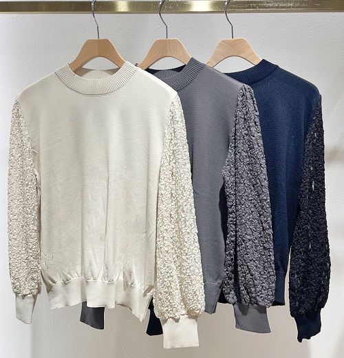 今年らしい透け感のあるレースを使用した、フェミニンな長袖ニット。