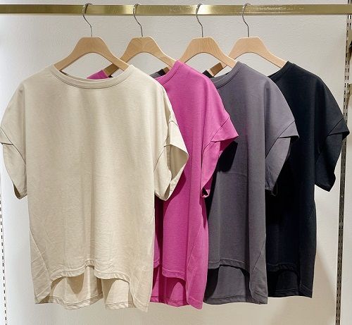 袖のデザインが可愛いダークカラーのシンプル無地Tシャツ。