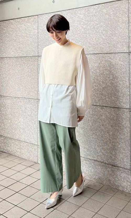 インナーにはふんわりとしたボリューム袖ブラウスで、フェミニンなシルエットに☆*:.。.