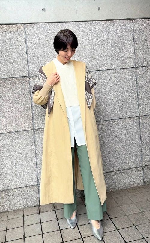 袖リブコート×ベストアンサンブル×ベイカーパンツ