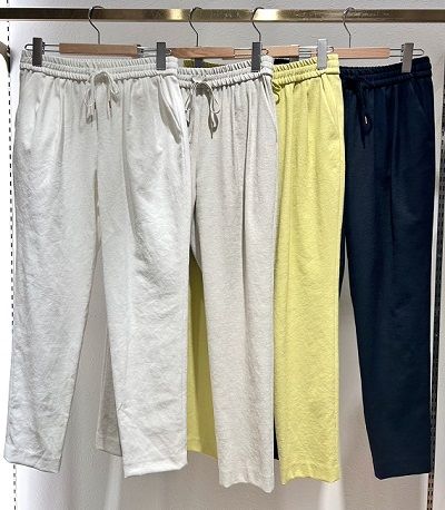 ウエストゴムでストレスフリーな穿き心地と、麻混素材のドライな肌触りで、