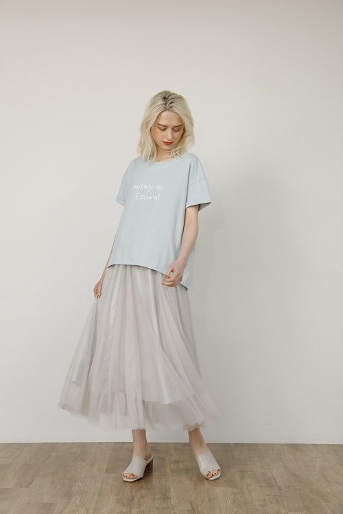 シンプルなTシャツには、チュールスカートなどフェミニンで