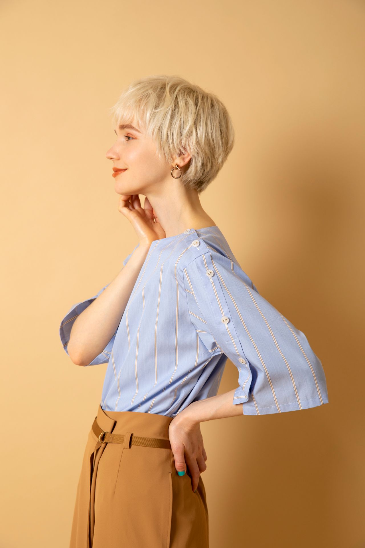 袖のボタンがアクセントになったブラウス。