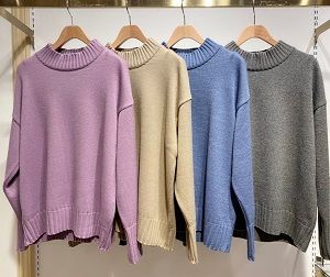 メランジ調のシンプルなハイネックニットは、