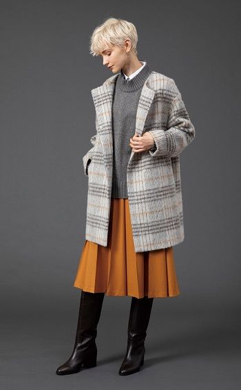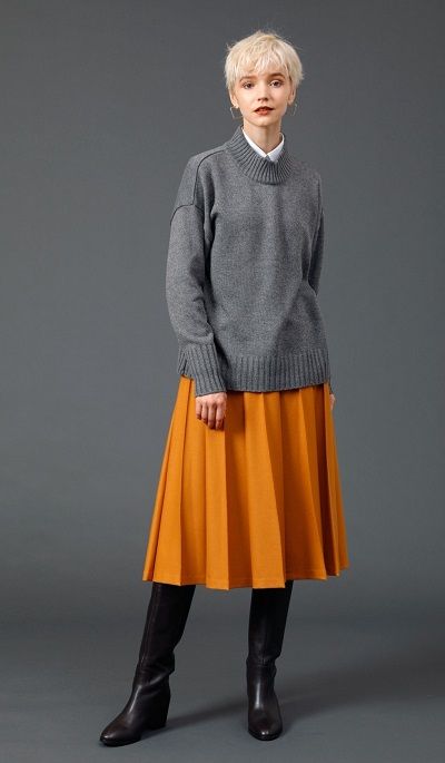マスタードのプリーツ風スカートを合わせてトラッドベースなスタイリングに。