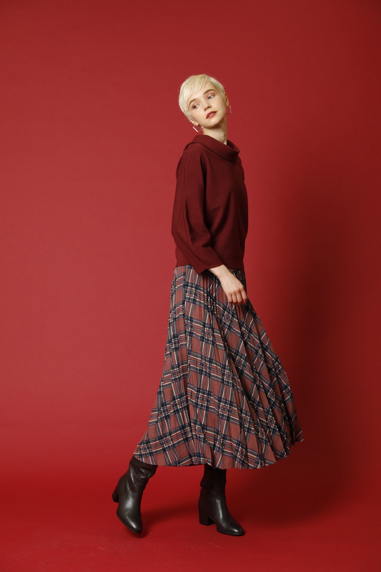 深みのあるワインレッドのニットに同系色のチェックプリーツを合わせて