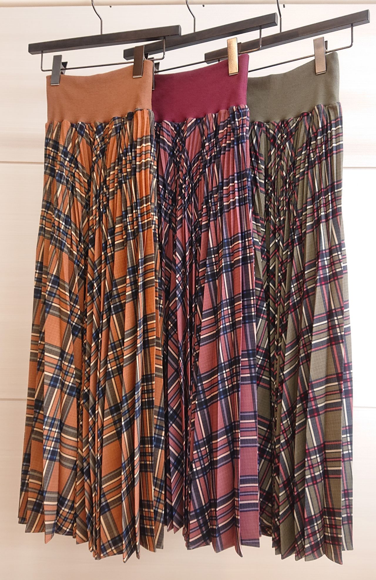 チェックのロングプリーツは様々なトップスに合わせやすく
