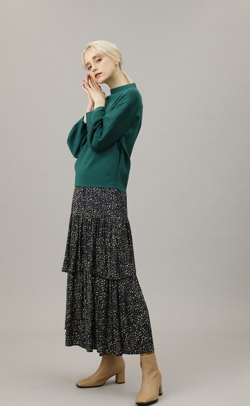 気分を明るくするポジティブカラー。グリーンニットとティアードスカートのスタイリング。