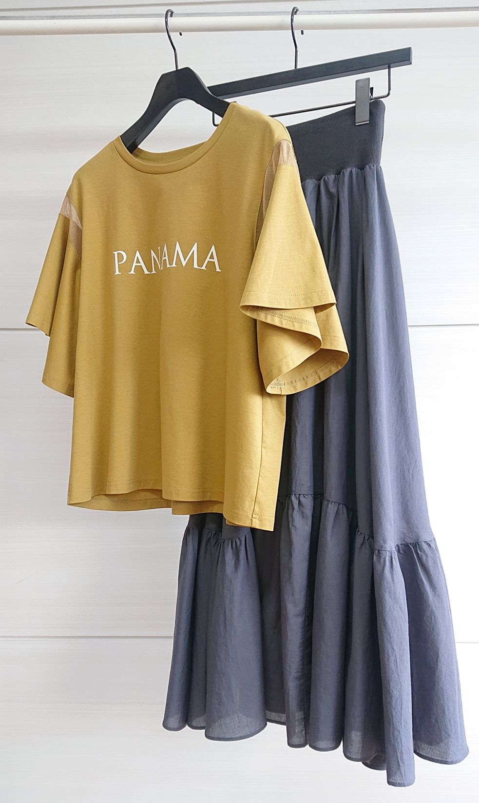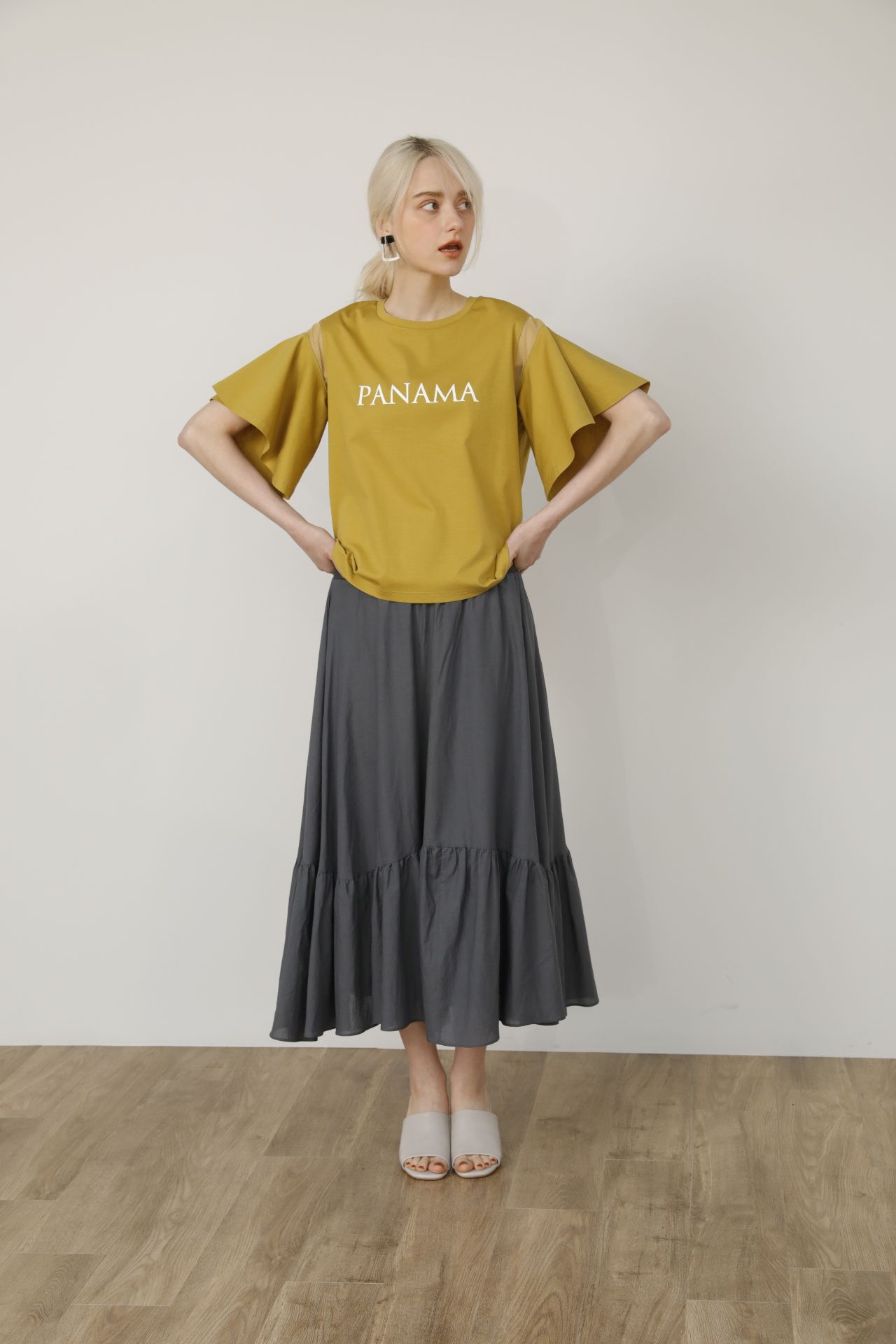 フレアスリーブロゴTシャツ×ティアードロングSKのカジュアルコーデ。