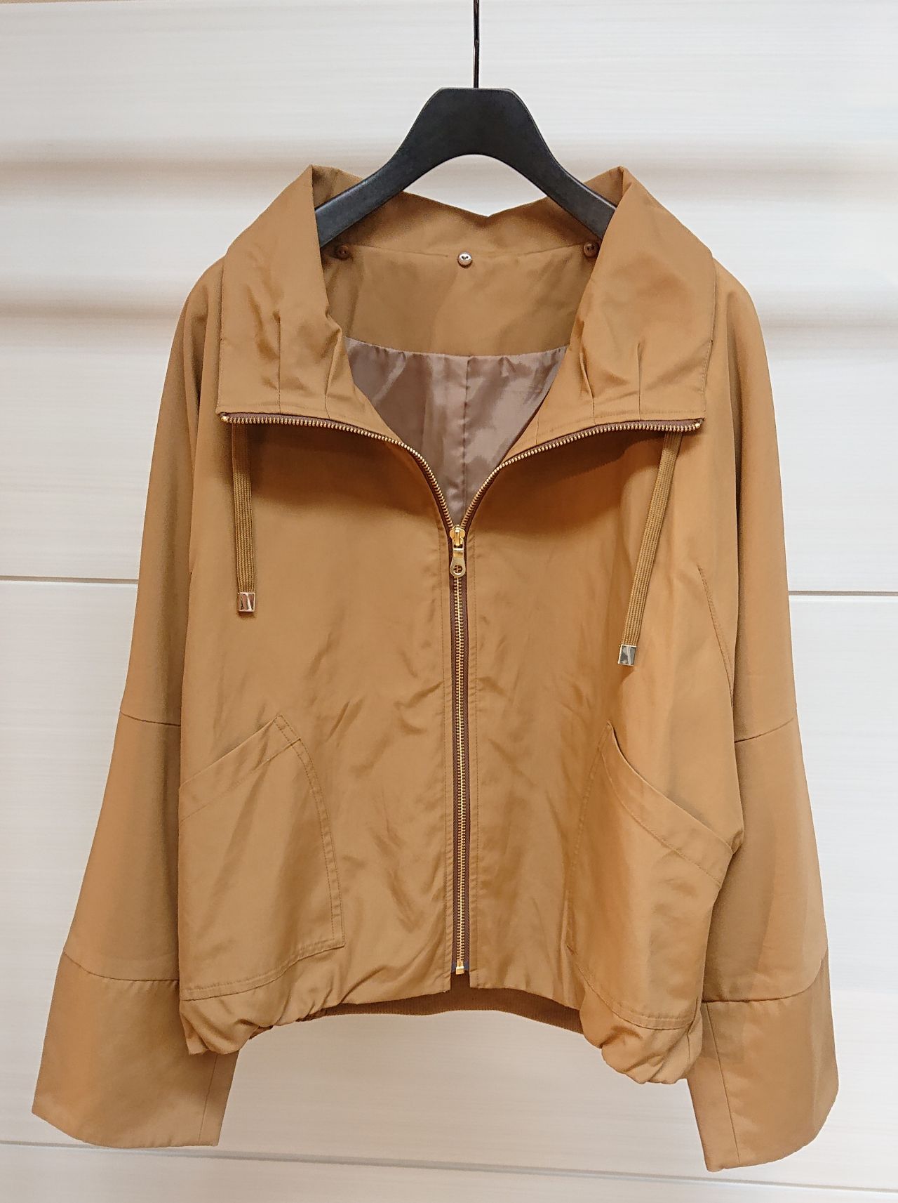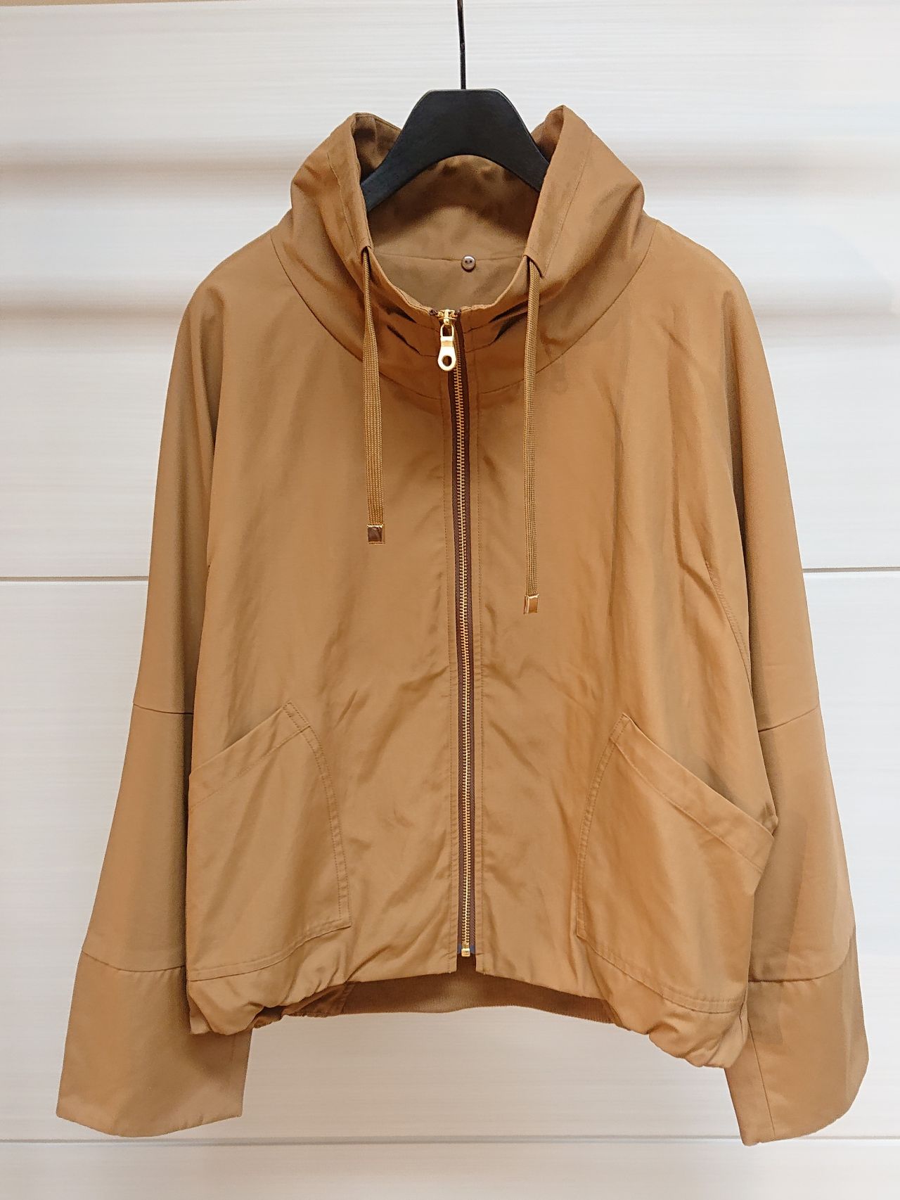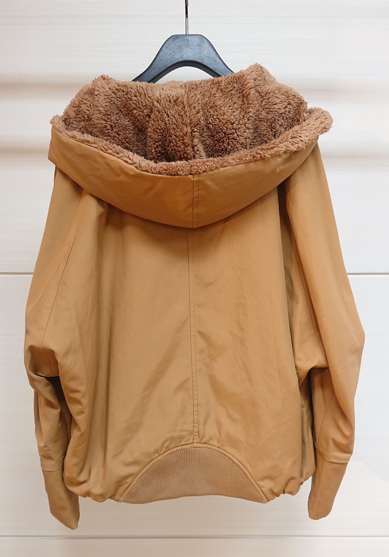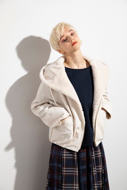 フードと前端にボアをあしらったマンパー風ブルゾン。