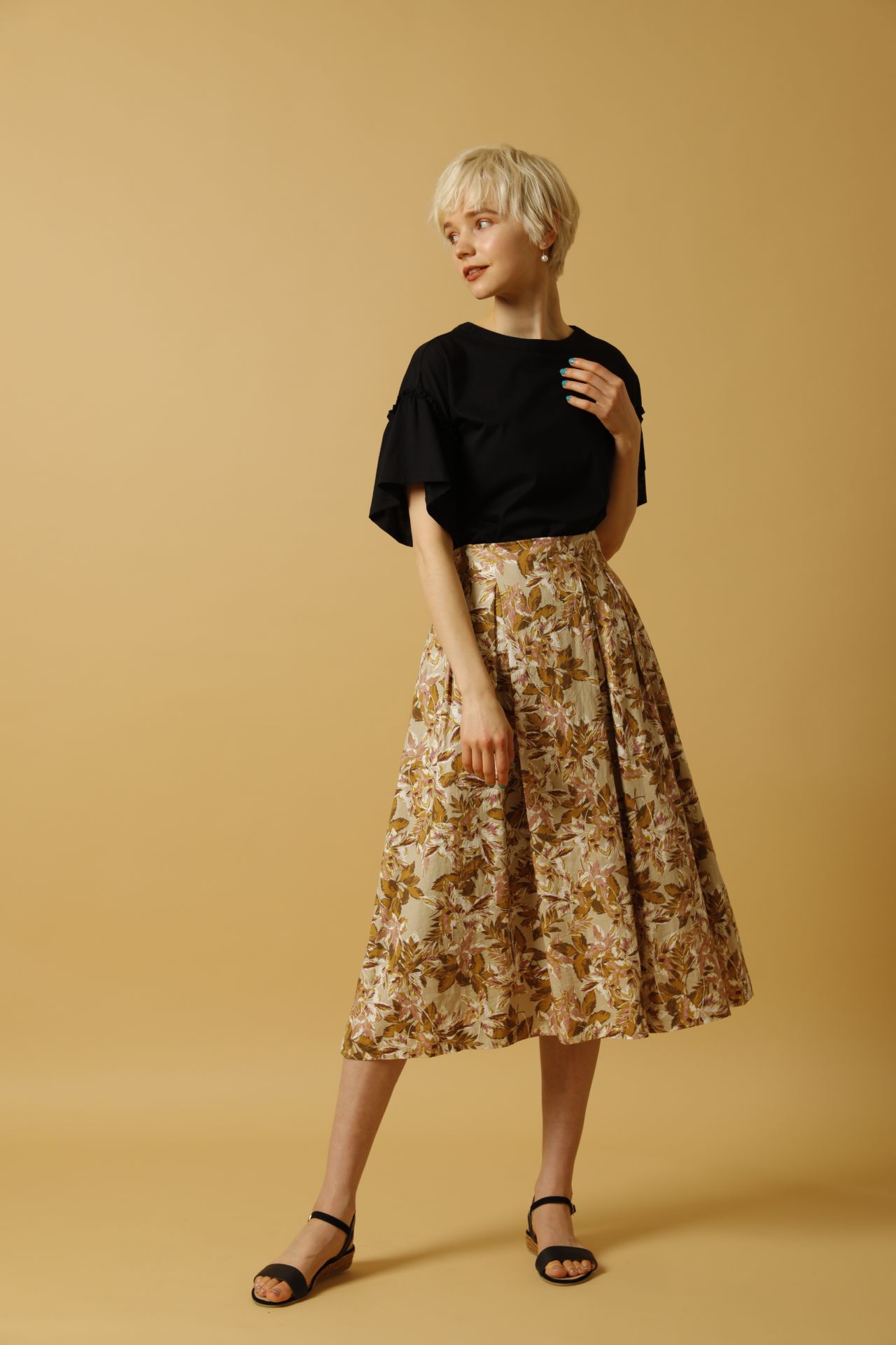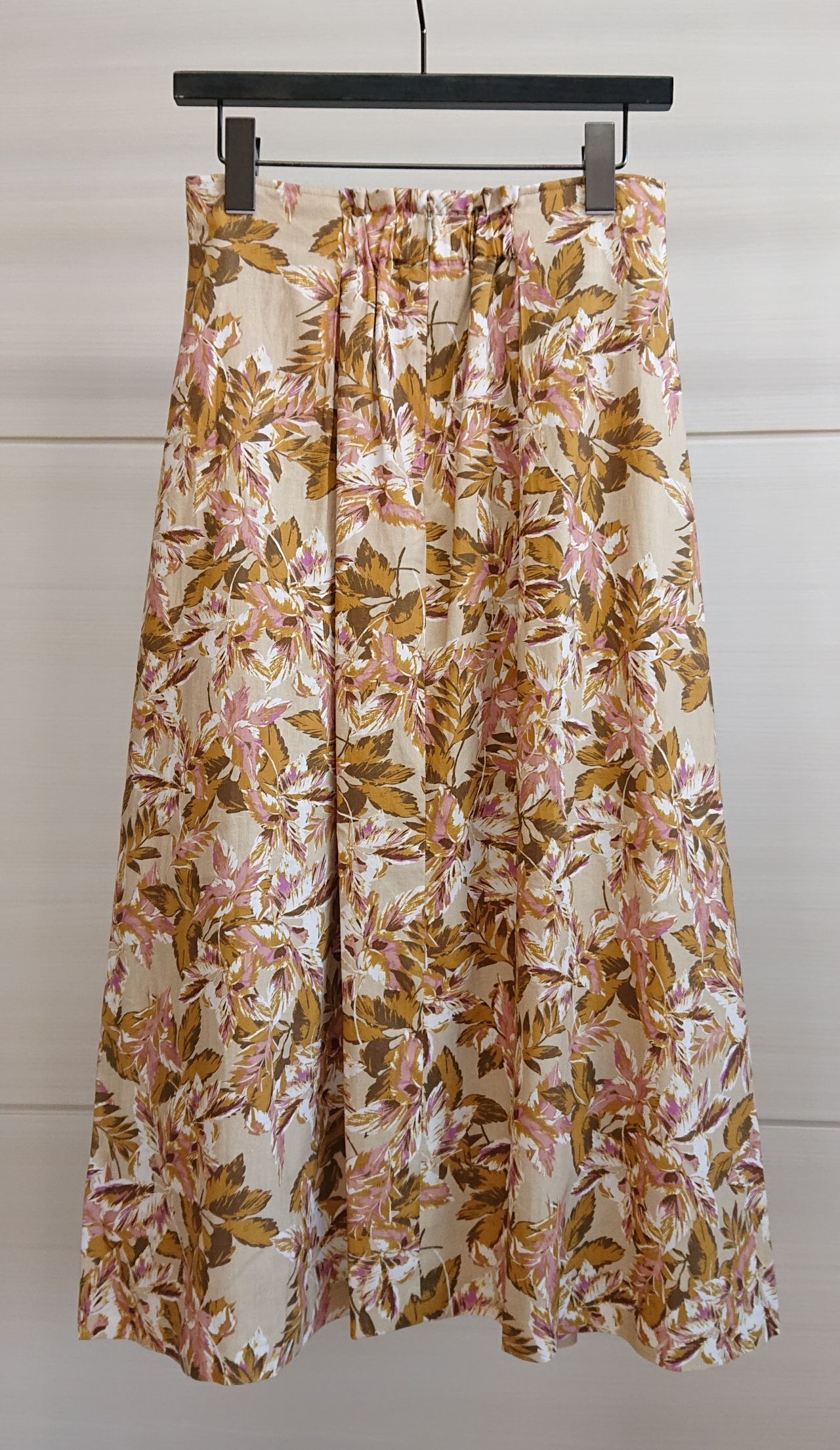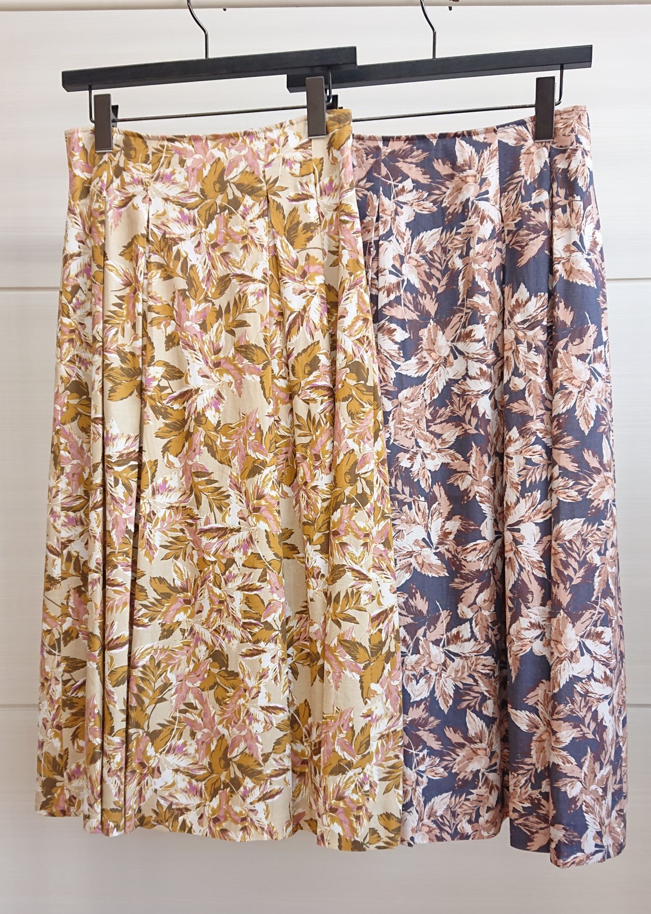 トレンドの麻素材を使用したリゾート柄のタックスカート。