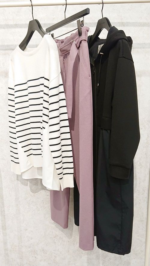 ボーダーニット × ワイドパンツ × フードコートのハイブリットスタイリング。