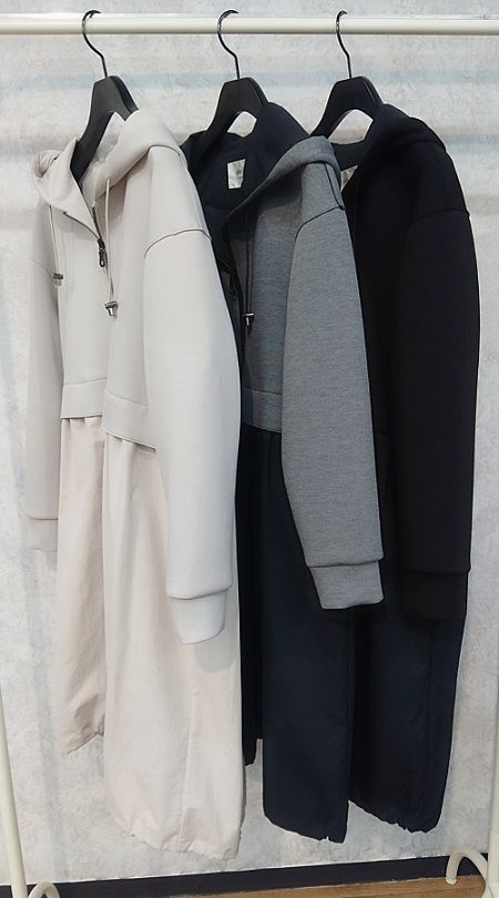 ダンボールニットと布帛生地を切り替えたフードコート。