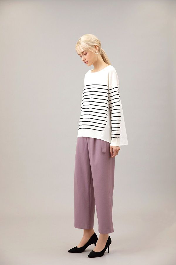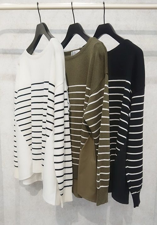 後ろ身頃を布帛で切り替えた、シンプルなボーダーニット。