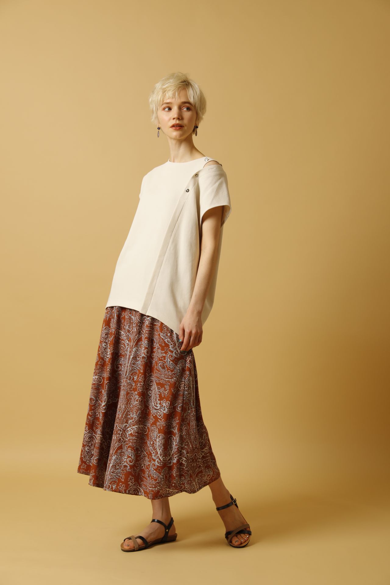 ペイズリー柄のガウチョパンツに旬なデザイントップスを合わせた