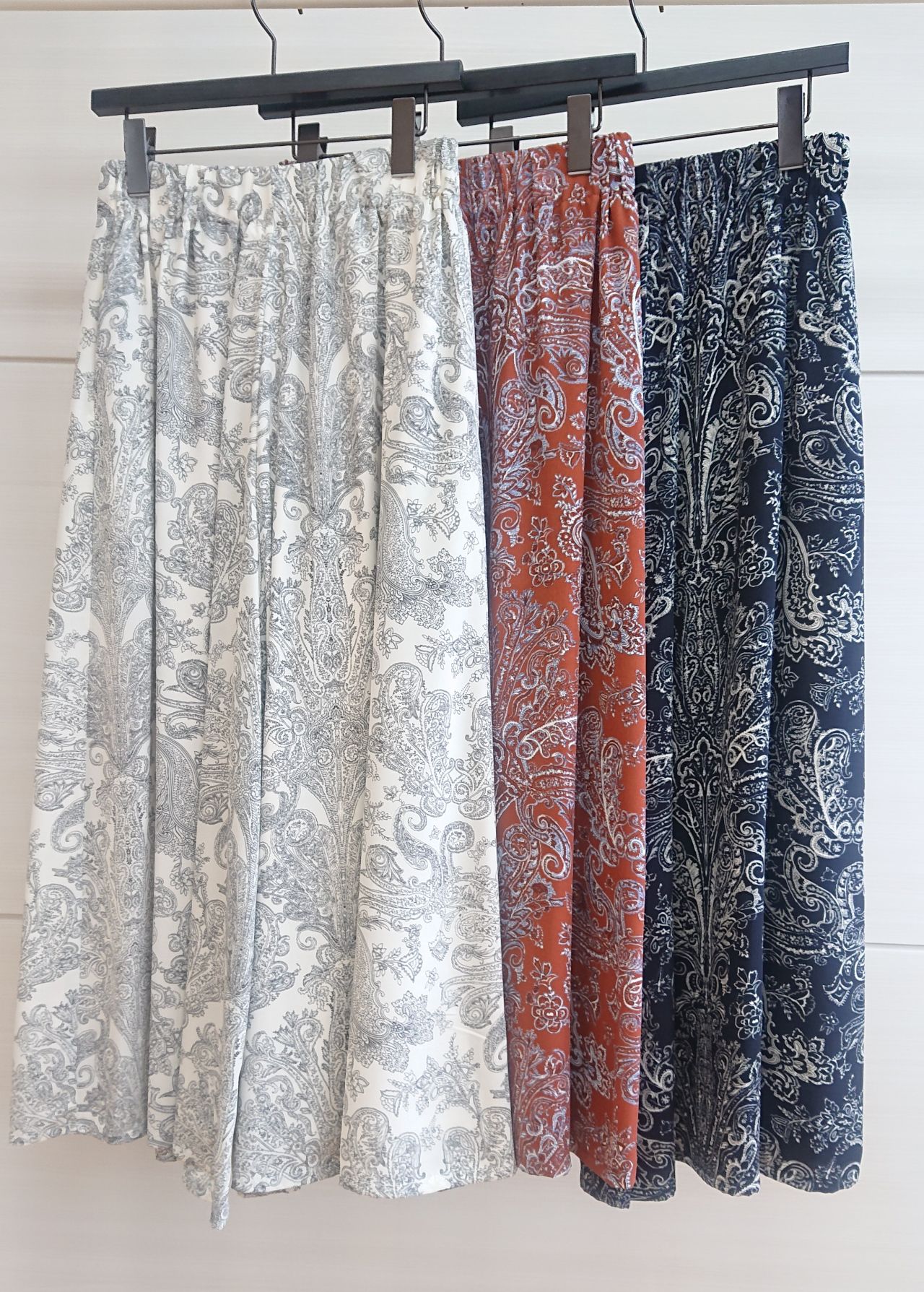 サマーダークな色展開のペイズリー柄ガウチョ。