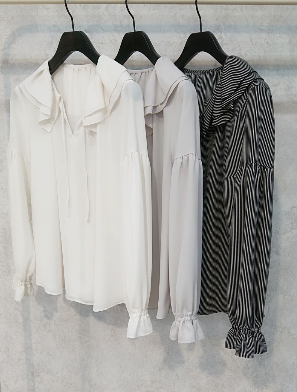 ①ソフトジョーゼットフリル襟ブラウス