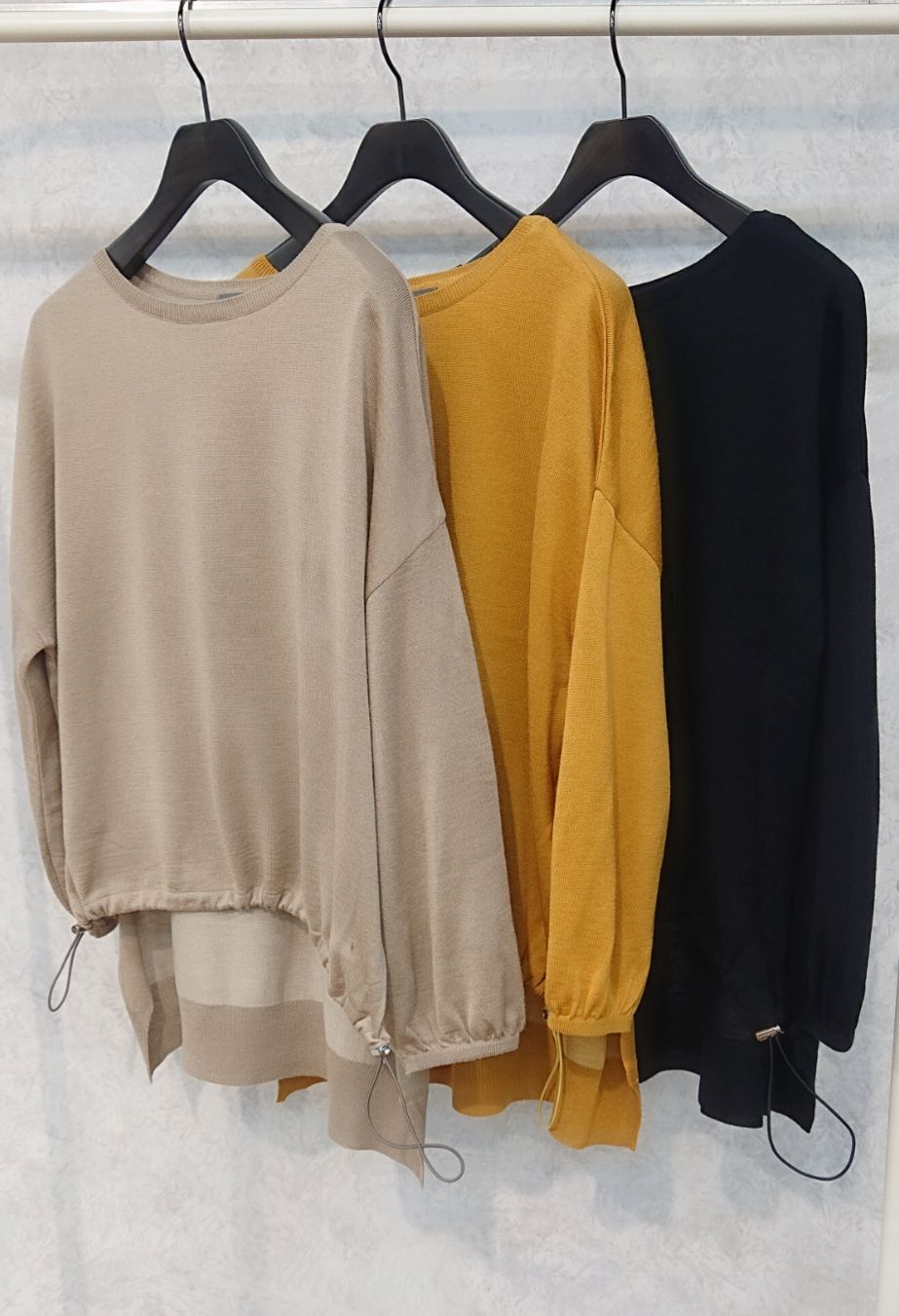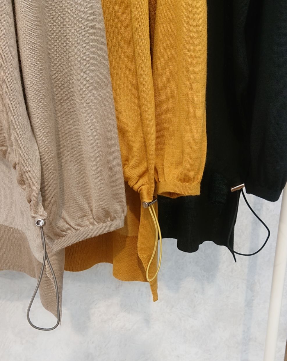 前裾をドロストコードでしぼれるゆるニット。