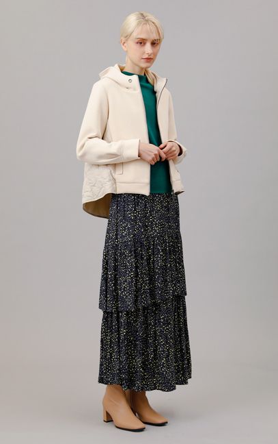 グリーンニットとティアードスカートのスタイリングにフードアウターを羽織って。