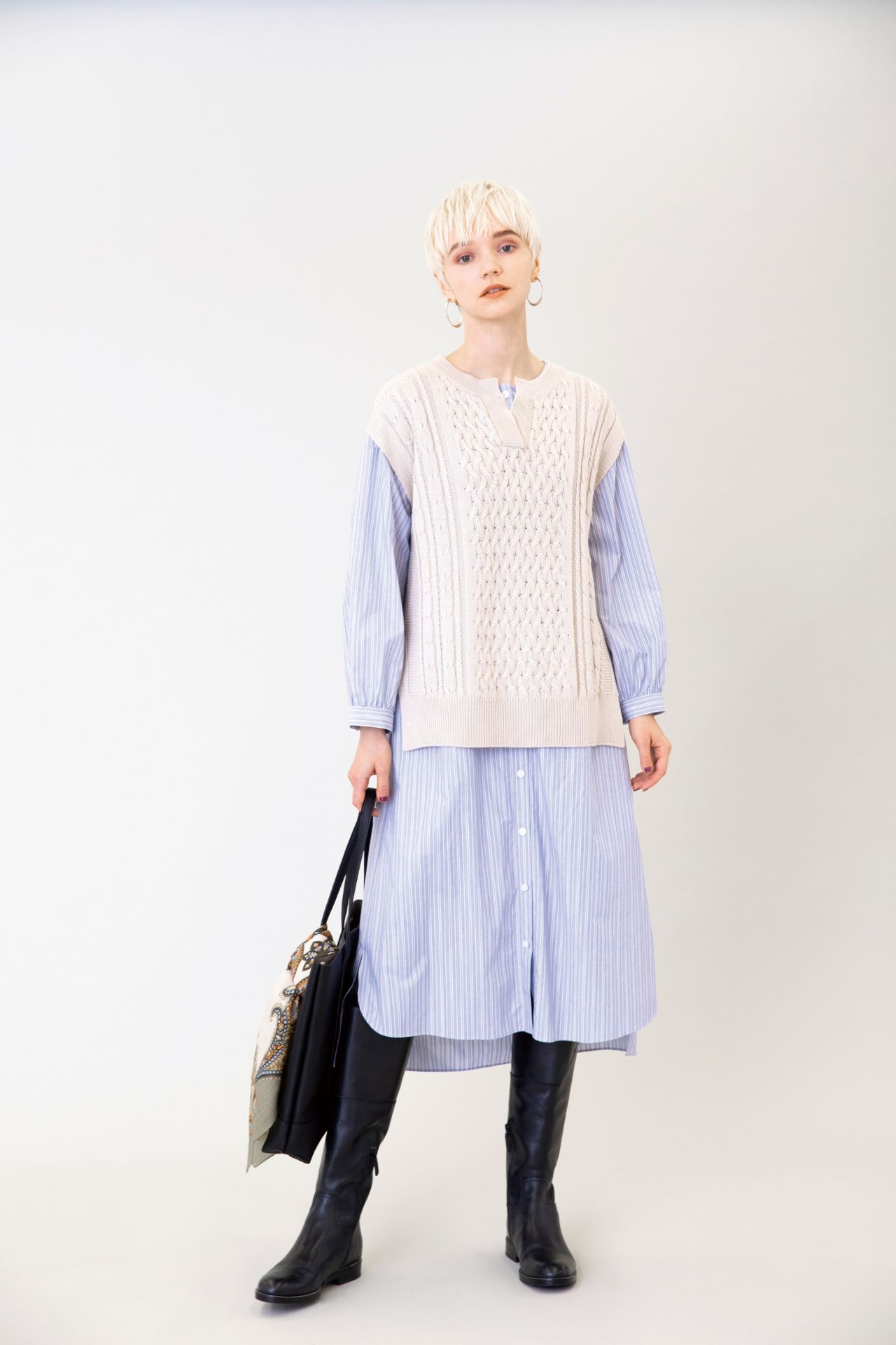 トレンド感のあるニットベストとロングシャツのレイヤードスタイル。