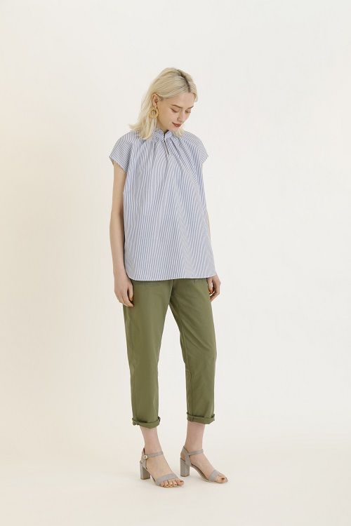スタンドフリルのフェミニンブラウスとベイカーパンツの甘辛MIXコーデ。