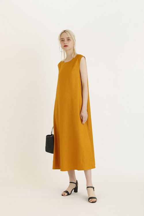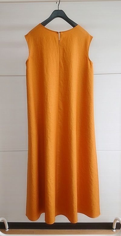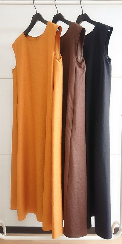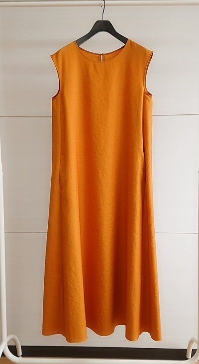 シンプルなテントラインのノースリーブマキシ丈ワンピ。