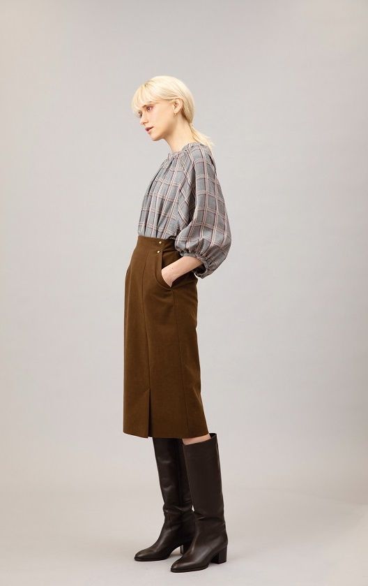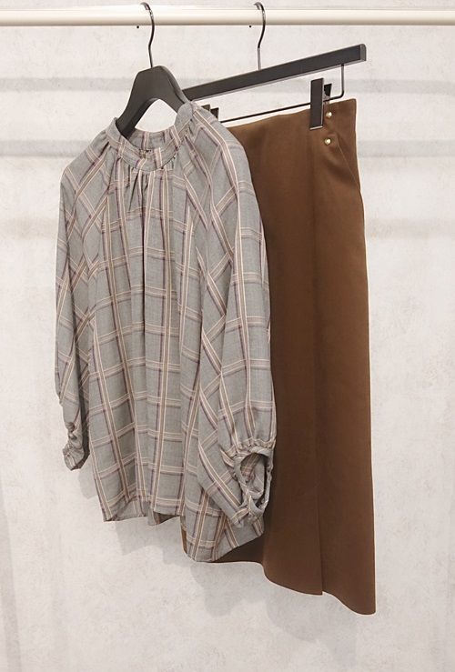 チェック柄のボリューム袖ブラウスにタイトスカートを合わせて。