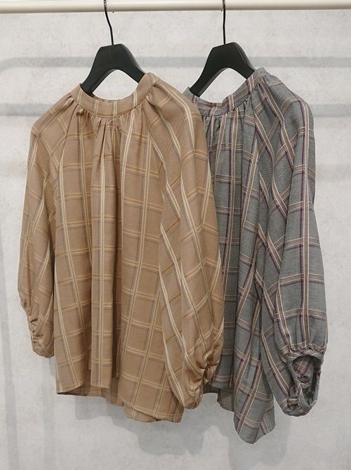①チェックスタンドギャザーブラウス