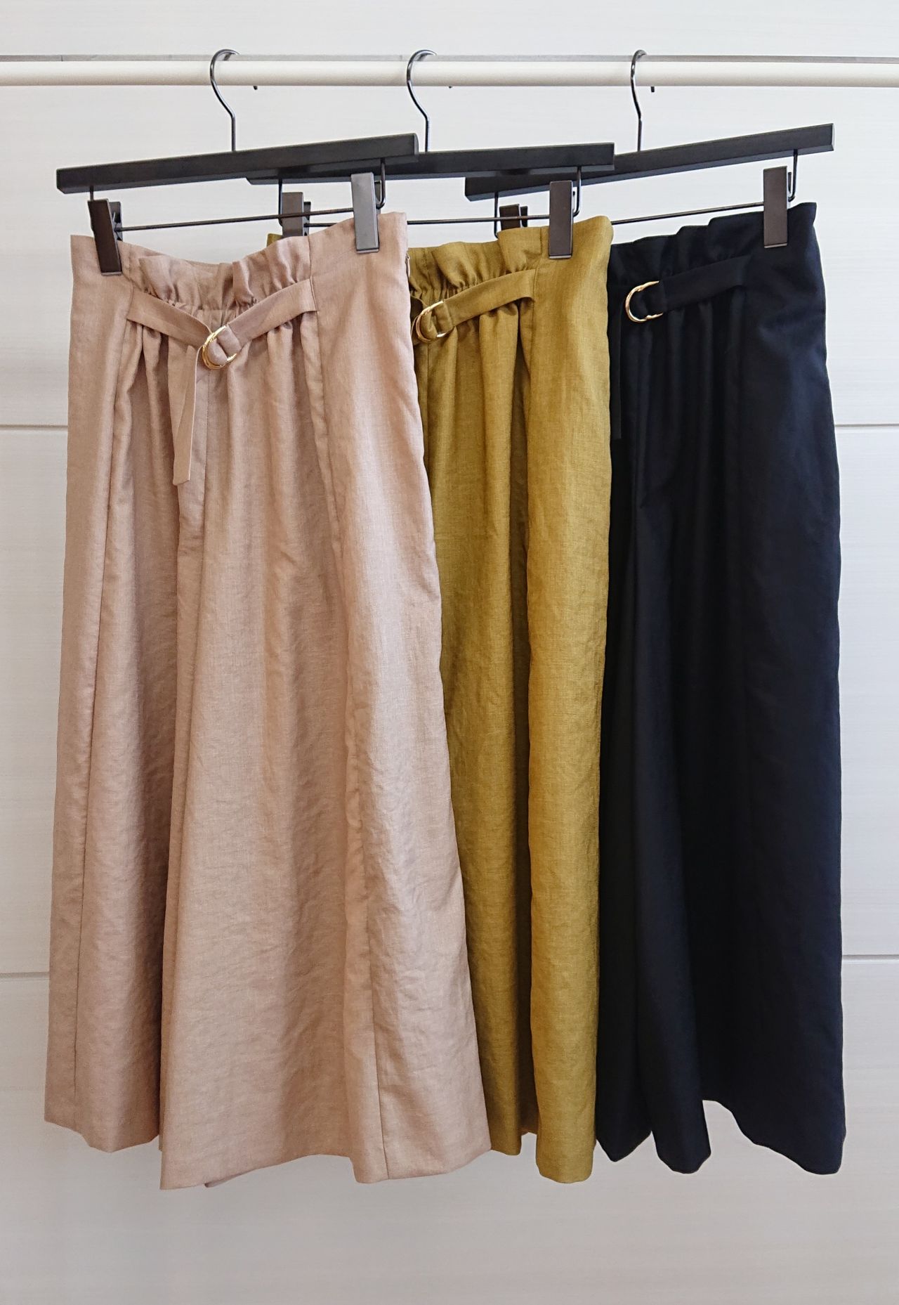 光沢感のあるポリエステル素材のガウチョパンツ。