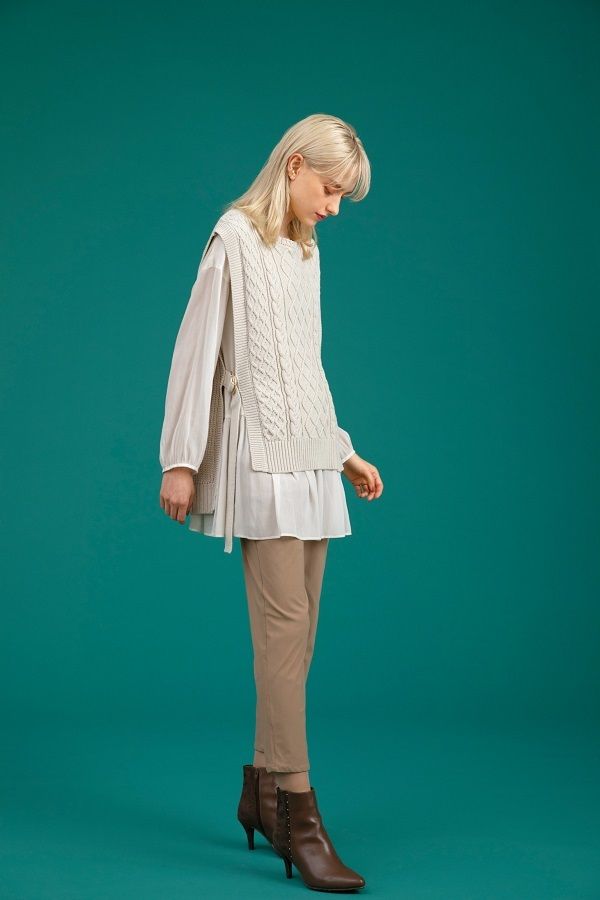 トレンド継続中のベストをティアードブラウスと合わせてフェミニンに。