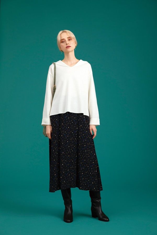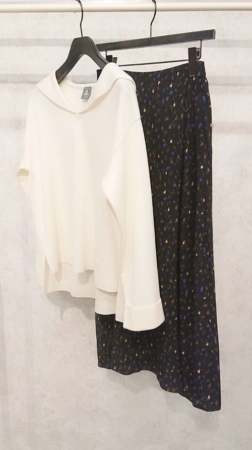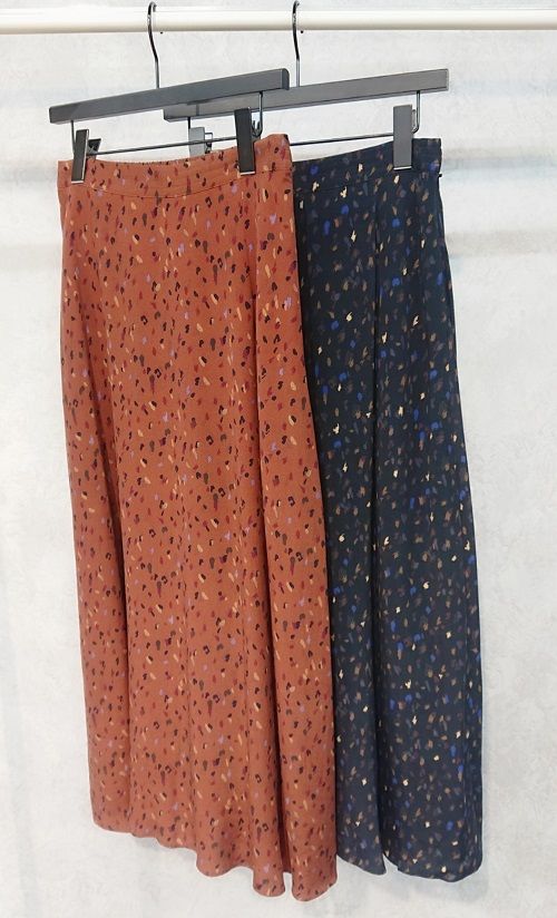 スッキリとしたシルエットでプリントスカートの他、