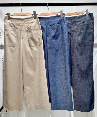 大きめのポケットが特徴的な、ワイドシルエットのデニムガウチョ。