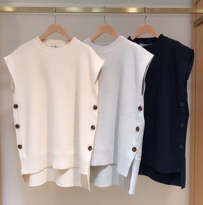 両サイドのボタンがアクセントのニットベストは、ご自宅で手洗い可能です♪